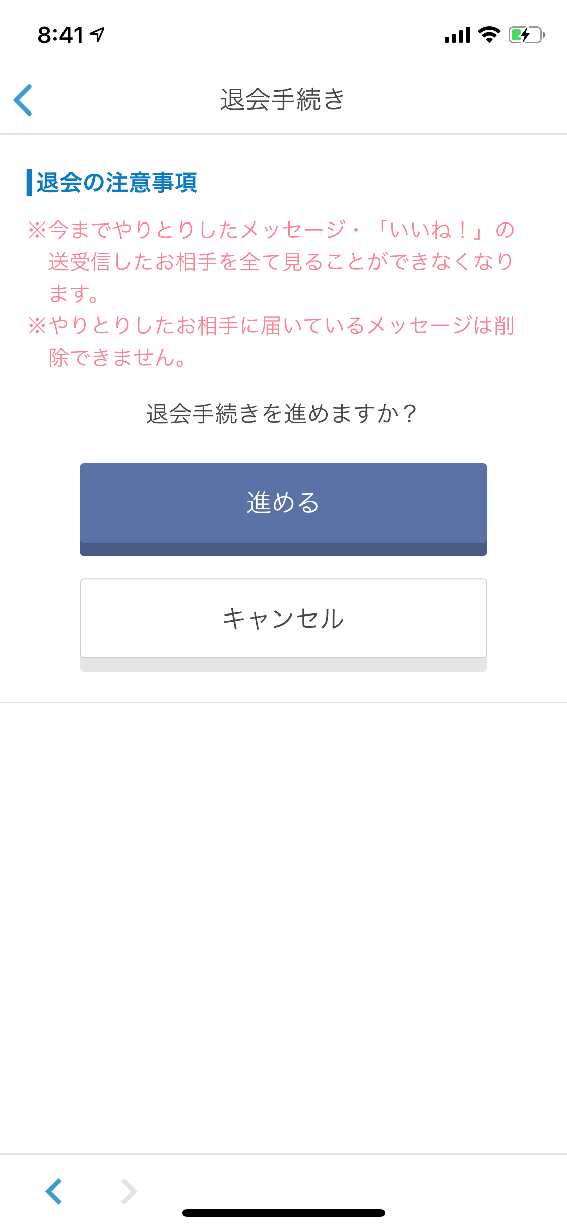 最後に以下のようなメッセージが表示されるので、自分の胸にもう一度聞いていみて、よければ、進めるをタップして退会手続きは完了となります。
